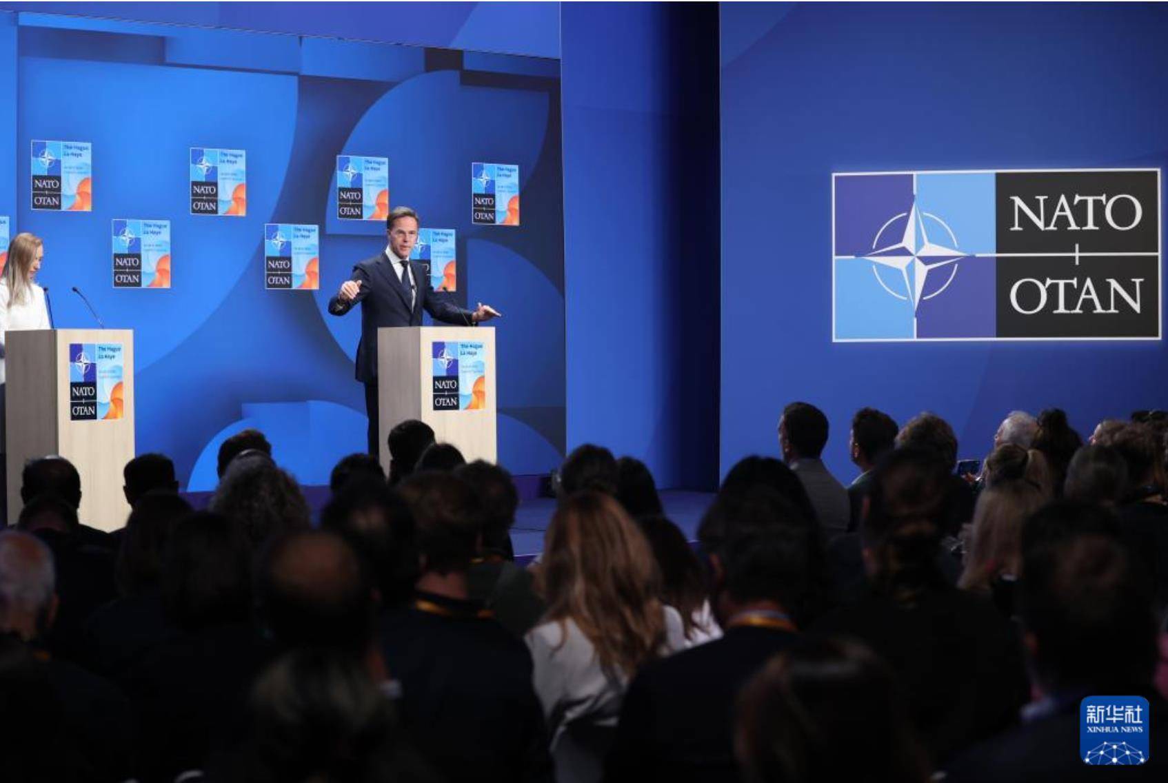 在荷兰海牙,北约秘书长吕特在北约峰会期间出席新闻发布会 图源:新华社