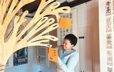 一名南非中文学习者在开普敦伊兹科博物馆内,将亲手书写的“开心平和”心愿卡挂上愿望树。 中新网记者 孙 翔摄